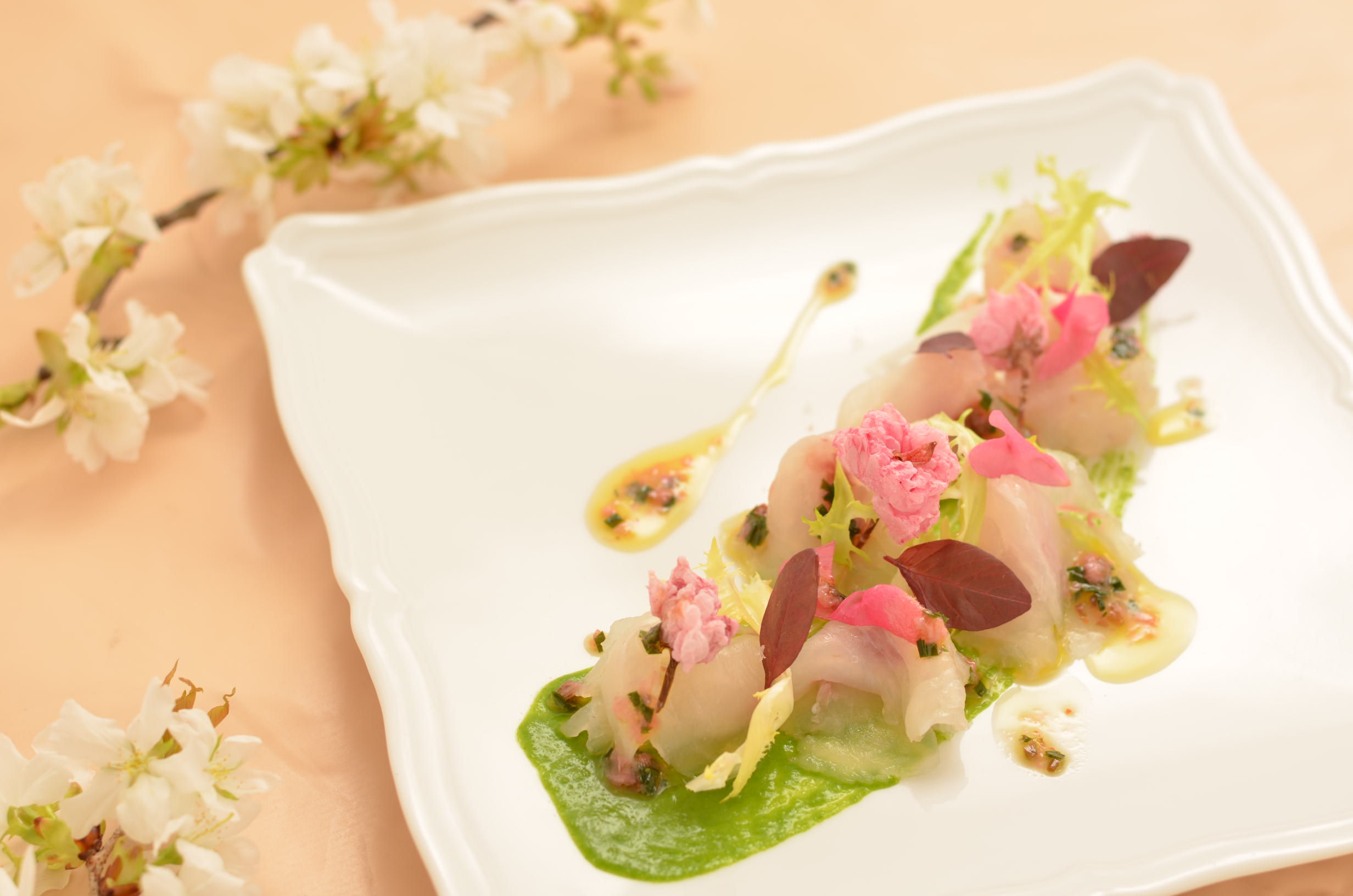 鯛を桜の葉の塩漬けでしめてしっかりと香りを移した、春を感じるカルパッチョ。